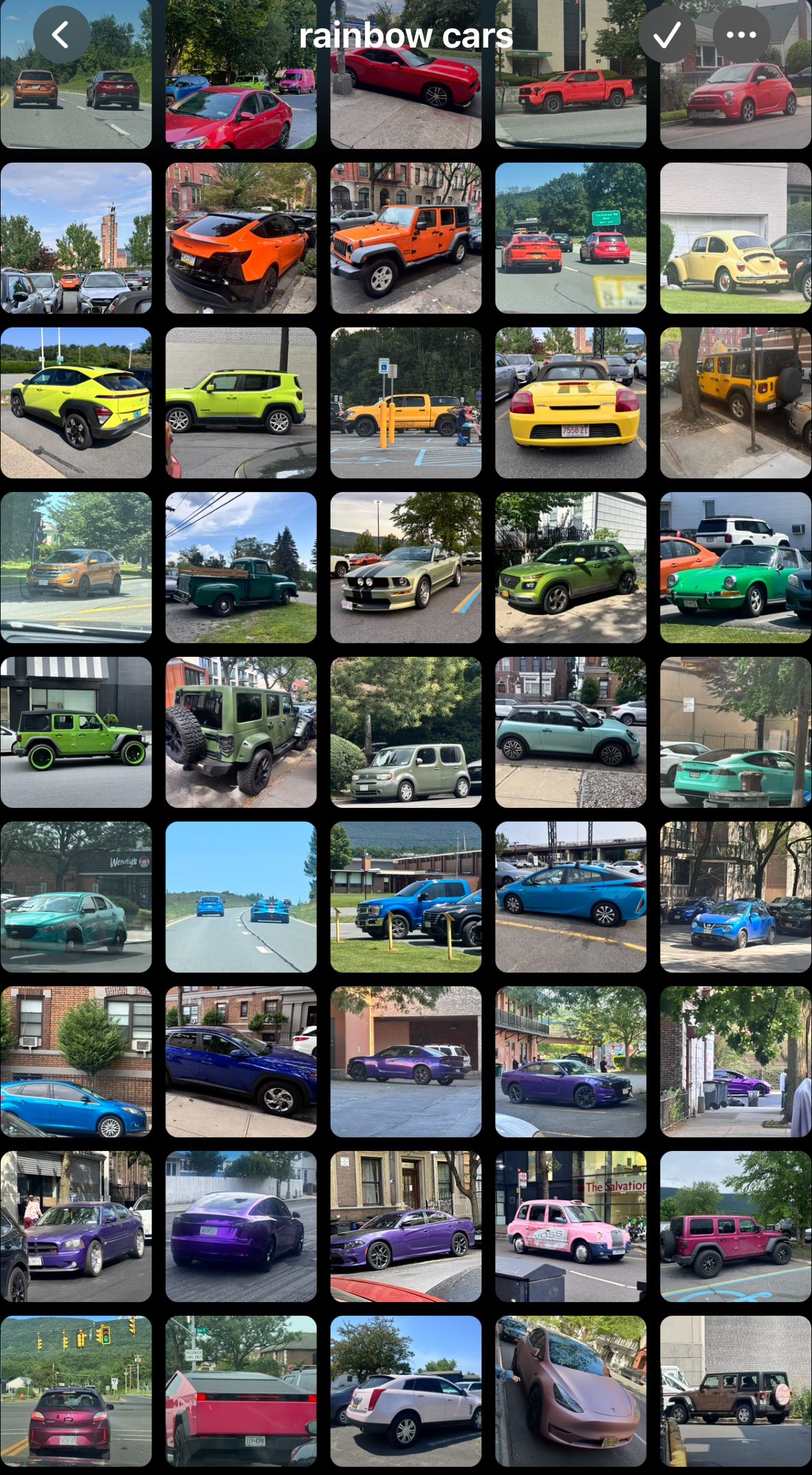 But no game has as “rainbow cars” as we drive around we collect cars in every color of the rainbow, with rare colors obviously getting more celebration. We keep track and count up to 10 cars of a certain color (yellow, orange, or green, usually) and then celebrate with a car dance party. I started a photo album below. This summer, we got my mom into it and she now sends us pictures of bright color cars she sees. Soon after, I started a photo album. (Did I edit it for this? I will never tell)