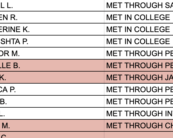 I started, of course, with a spreadsheet. I went through our various group chats and mutual friends lists and just compiled lots of data. I accumulated a lot of information, but it was clearly incomplete and I had a lot of questions.